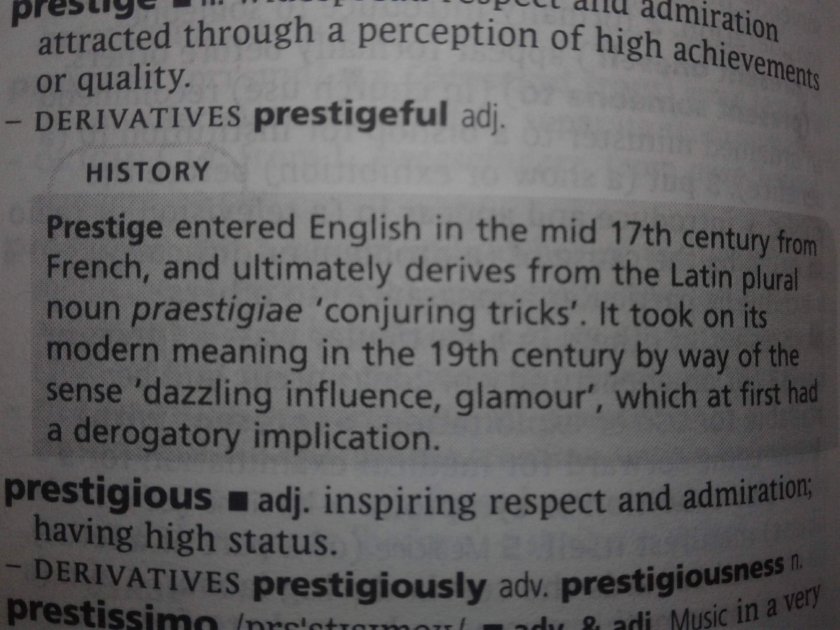 PRESTIGE entered English in the mid 17th century (tricksy, cuz it means the 1600’s) from French, and ultimately derives from the Latin plural noun praestigiae ‘conjuring tricks’.